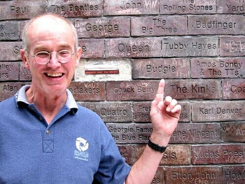 | Peter Boot with his brick in the wall of fame at the Cavern. Our incredible Host and organizer of the Parkinson's benefit. |